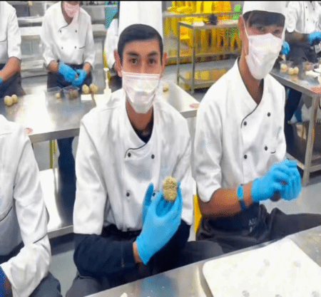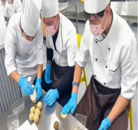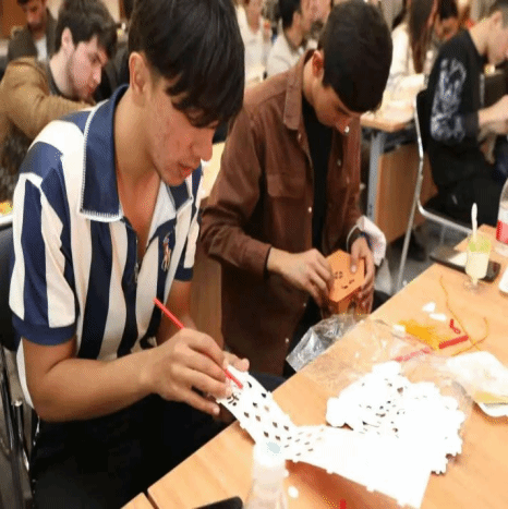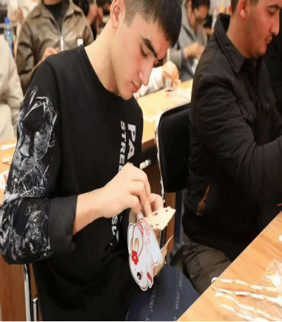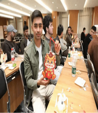 文化讲解结束后,手工体验环节随即展开,现场早已备好冰皮粉、豆沙馅、花灯套件等材料工具。在专业师傅指导下,留学生们戴手套揉冰皮、称馅料、压模具,巴基斯坦留学生阿里第一次尝试便遇到 “露馅” 难题,马媛老师立刻上前示范:“轻轻捏合边缘,就像守护一份团圆。” 当印着 “福” 字、桂花纹样的月饼成型,留学生们纷纷举着作品拍照留念。花灯制作同样热闹,竹篾搭架、粘贴玉兔图案、连接 LED 灯串,师生协作中,一个个兼具传统韵味与创意的花灯逐渐完成,塔吉克斯坦留学生卡莫给花灯系上彩色流苏:“晚上点亮它,像把天上的月亮带回家了。”