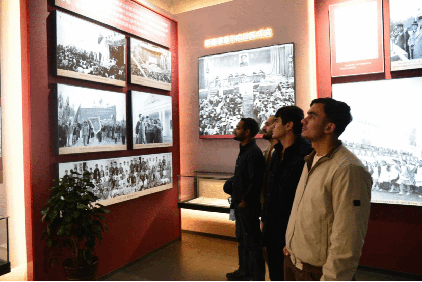 当日下午,留学生们有序进入展览馆。5500余平方米的展区内,1600余幅珍贵图片、1400余件实物模型与150余个沉浸式多媒体场景,通过“万方乐奏换新天”“潮涌天山展宏图”“美丽新疆铸辉煌”三大篇章,全景式铺展新疆70年发展画卷,让留学生们目不暇接。