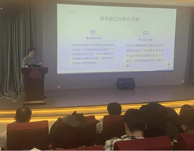 讲座结束后,科研指导环节有序开展。刘洋老师以《基于技术进步视角的中国经济发展理论研究》、夏衣热老师以《数字技术对农业碳生产率的影响研究》、丁红艳老师以《对口支援助力新疆新质生产力发展的机制与组态路径研究》为题,分别汇报了课题申报书的核心思路、研究方法与创新点。周亚虹教授逐一对申报书进行细致点评,从选题聚焦、研究框架优化、文献综述深化、实证设计完善等方面提出针对性建议,指导老师们精准把握课题申报的核心要点,增强申报材料的竞争力。
